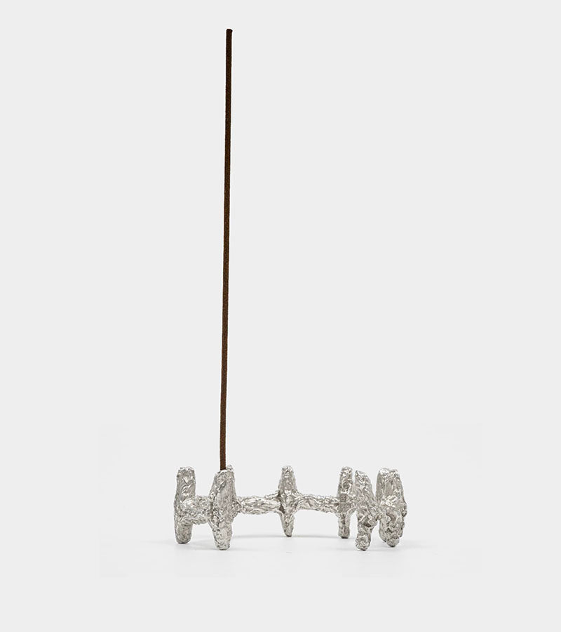 The Gathering Bracelet by Sol Seok, designed by Ali Gallefoss. Incense holder and armring in 925 sterling silver. Worn on body, it reads as a sculpture. Placed, it becomes an altar. Holds standard Japanese incense sticks. Wear solo or stack with our jewellery for stronger presence.