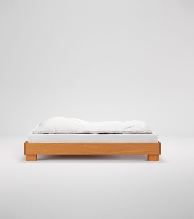 The Cubico Bed Frame in Light Amber from RYE is a contemporary interpretation of the low-profile platform bed, designed by Italian designer Martina Branchetti. Crafted from solid beech wood, its horizontal form features subtly chamfered edges resting on four sturdy, pillar-like legs that lend the piece a grounded, architectural character. The deep Light Amber stain recalls to traditional Mediterranean mid-century furniture design.